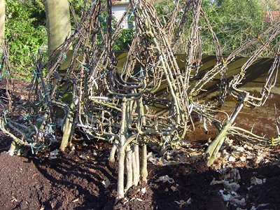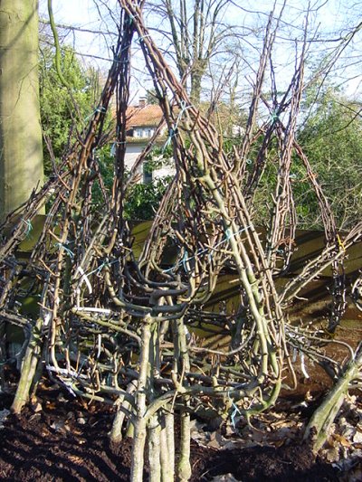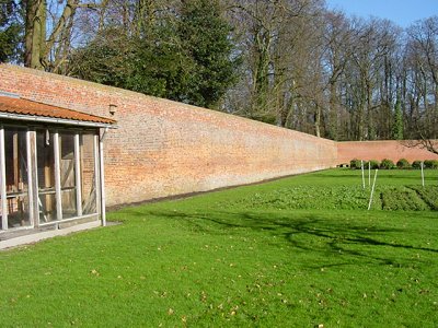 Spalierobst im Einschlag für die Erneuerung der Spalierobstanlage im Küchengarten entlang der Mauer. Ausführung der Arbeiten: Frühjahr 2002