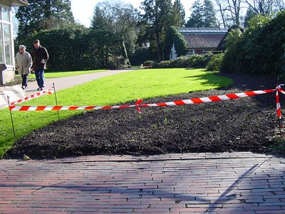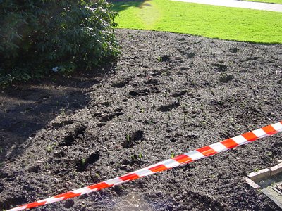 Die rot-weißen Bänder im Schlossgarten sind keine übrig gebliebenen Dekorationen vom letzten Karneval - sie kennzeichnen die Grenze zwischen Weg und Beet für Zeitgenossen, bei denen die Grenzen fließend sind oder die ihren Schuhabdruck im Blumenbett dekorativer finden als die sich entwickelnde Blumenpracht. |