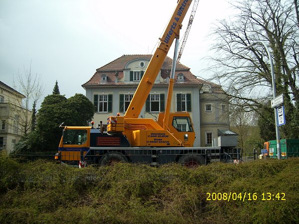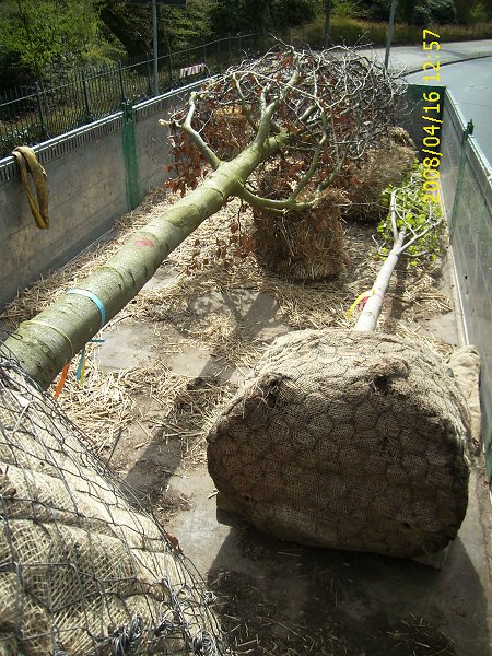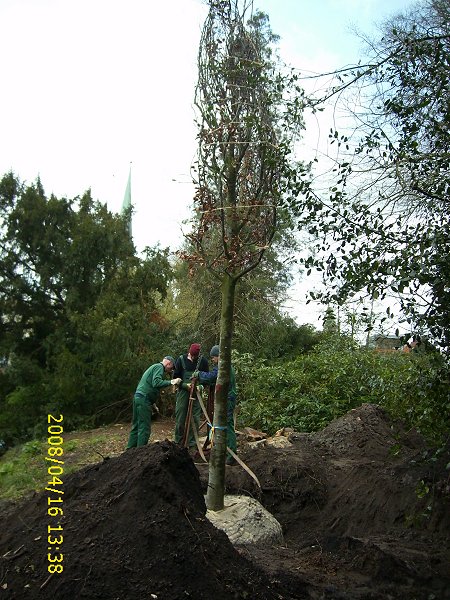 Im vergangenen Herbst haben leider alle Lebensgeister der ältesten Blutbuche im Schlossgarten aufgegeben und sie fiel, von einer Windböe ergriffen, in eine vor ihr liegende große Rhododendrongruppe. Der prachtvolle Parkbaum war eine ehrfurchtsvolle, malerisch gewachsene Gestalt und mit seinen ca. 250 Jahren einer der ältesten Bäume im Schlossgarten. Das rotlaubige Gehölz hat uns begeistert und selbst im Herbst beeindruckte der Baum die Besucher mit seiner fantastischen gelbbraunen bis orangenen Herbstfärbung. Die Blutbuche litt schon lange unter dem flachen Lackporling, der schon dachziegelartig am Stamm übereinander wuchsen. Dieser Schwächeparasit hat im Stammfuß- und im Wurzelbereich eine intensive Weißfäule verursacht. Im Inneren des Baumes fand somit ein Holzabbau statt, welcher zur Gefährdung der Standfestigkeit führte. Rückblick Sommer 2007: Fünf Oldenburger hatten sich bei herrlichem Sonnenschein auf einer Gartenparty zusammengefunden und philosophierten über den Schlossgarten mit seinen Bäumen. Inspiriert durch den Garten suchte man nach einem Projekt im Schlossgarten. In Zusammenarbeit mit der Schlossgartenverwaltung konnten die Herren für die Neuanpflanzung einer Blutbuche begeistern und gewonnen werden. Der Anlass und die Namen der Spender sowie der Betrag wurden kurzerhand schriftlich fixiert. Im Herbst fand man sich bei der Baumschule Bruns zusammen und suchte, unter dem wachsamen Auge des Herrn Rahenbrock, eine Blutbuche aus. Die alte Blutbuche fiel zu diesem Zeitpunkt dem Sturm zum Opfer. Der Winter ging vorüber, der Frühling kam und mit ihm unsere neue Blutbuche. Die Firma Hotze griff dem Schlossgarten, zur Freude der Mitarbeiter, mit einem Minibagger unter die Arme und schaufelte das ungefähr 3x3m breite Pflanzloch. Dank der Hilfe vieler fleißiger und findiger Helfer wurde die Buche von einem Kran der Firma Ulferts und Wittrock- vielen Dank an Herrn Möller- in ihr Pflanzloch gehoben. Dafür musste die Schlossgartenverwaltung die Gartenstraße vorübergehend einspurig sperrenlassen, wofür die Autofahrer jedoch großes Verständnis zeigten. In Anwesenheit der Sponsoren wurde die Blutbuche an den historischen Platz gepflanzt, dabei getauft nebst dem dazugehörigem Glas Prosecco und einem verlesenen Gedicht von Hesse. Nachstend einige Fotos von der Neuflanzung.