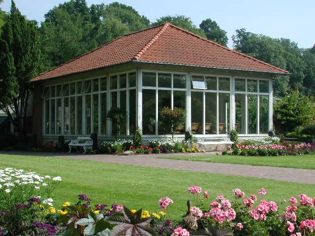 Der Glas-Pavillon am Nordrand des Wirtschaftshofes wurde 1958 unter dem Gartenleiter Heber errichtet. Die großen Glasfenster sind in Richtung des zur gleichen Zeit in einen Sonnen- bzw. Rosengarten veränderten Obstgartens ausgerichtet.